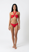 Make a statement in the Marianna Icon - a striking red halter-neck bikini accented with luxurious gold details. This bold two-piece combines vibrant colour with sophisticated metallic touches, perfect for turning heads at the beach or poolside.